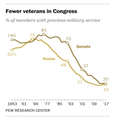 With nearly 20 million military veterans today, we have seen a substantial decline in the percentage of those in the Senate and House who represent them. The United States Congress is made up of just under 20% who have served in the military, an astonishing decline given that the number was near 80% in the 1980s.