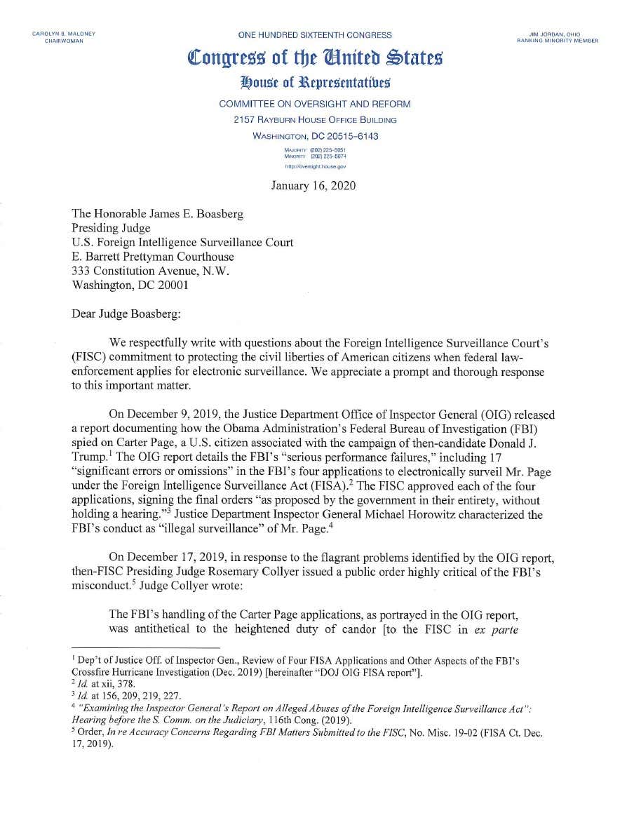 Jordan and Meadows, who set a deadline of Ja.n 30, also asked the FISA court in their letter about steps it has taken to review its conduct and whether it bears any responsibility for the FBI’s surveillance of Page.